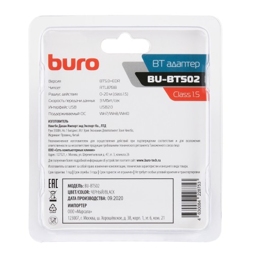 Адаптер USB Buro BU-BT502 поддерживает Bluetooth 5.0+EDR, класс 1.5, дальность до 20 м. Компактное устройство для беспроводного подключения периферийных устройств к ПК и ноутбукам, совместим с сетевыми картами и адаптерами. Удобен в установке, обеспечивает устойчивое соединение и низкую задержку. Цвет черный.