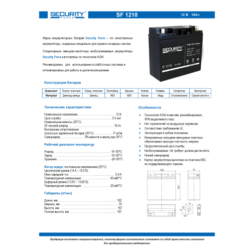 | Особенности | Технология AGM (Absorbent Glass Mat). Соответствие требованиям UL |