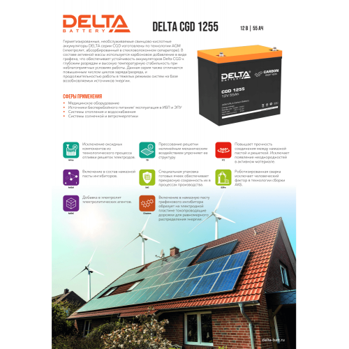 Аккумуляторная батарея Delta CGD 1255 напряжение 12В, емкость 55Ач (230х138х205mm)