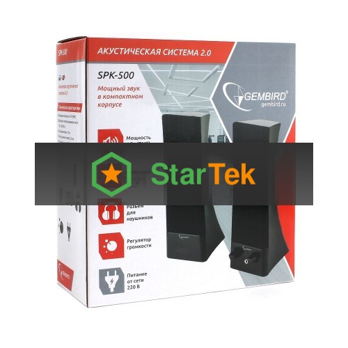 Компьютерная акустика Gembird SPK-500 2.0, черный, мощность 6 Вт. Простая установка: питание от сети, регулятор громкости, разъем для наушников. Компактный формат подходит для стола, качественный звук для повседневного использования.