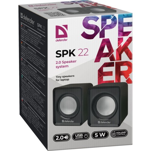 Акустическая 2.0 система Defender #1 SPK 22 черный — компактная компьютерная акустика мощностью 5 Вт, питание от USB. Обеспечивает чистый звук и удобство подключения к ПК и ноутбукам без дополнительных блоков питания. Стильный черный корпус и простая настройка подходят для домашнего и офисного использования.