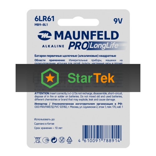 Батарейки Maunfeld PRO Long Life Alkaline 9V(6LR61) MB9-BL1, блистер 1 шт.