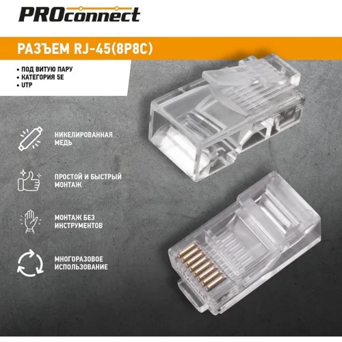 | название | Proconnect (05-1021-3) Разъем RJ-45 (8P8C) под витую пару, UTP, CAT5e (100 шт.) |