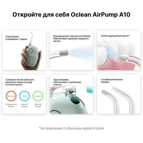 Ирригатор Oclean AirPump A10 W7602 серый — современный компактный ирригатор для гигиены полости рта. Оснащён мощным насосом и различными режимами давления для нежного и эффективного удаления налета между зубами. Удобный ручной или настенный монтаж, сменные насадки и долгий срок службы аккумулятора. Лёгкость использования и достойная производительность подходит для регулярного ухода за зубами.